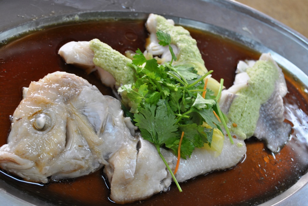 这种鲜绿色的姜蓉酱料,正是阿莲的致胜武器,色泽看起来有点像是日本餐里常见的山葵wasabi,可是多年来却是阿莲蒸鱼头深受欢迎的关键因素, 因此也有顾客将这种酱料戏称为Wasabi酱料。别小看这种看似非常稀释的酱油,这可是阿莲专为灵鱼头调配烹煮的独家酱汁,相较于一般单调死咸的酱油,这种油水酱液多了一份鲜甜腴滑的底蕴,搭配绿色的姜蓉酱料,起着融合互补的作用,姜蓉、蒜米和芫荽这些原本个性就特别强烈的佐料,变得更顺喉讨喜,如此用心研制的酱料,就纯粹为了衬托灵鱼头,让每一口鱼肉尝起来更加深邃迷人。